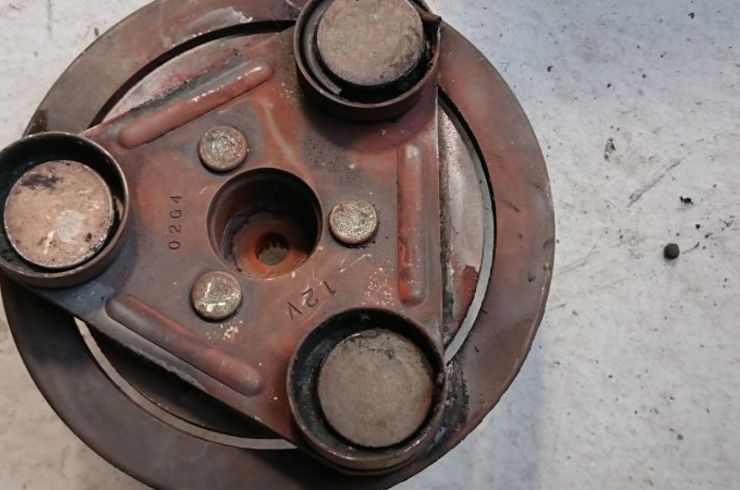 2018/08/16H16/7 マツダ デミオ DY3W A/Cが効かないとの事で、入庫しました。 入庫された時には、ゴーゴーガーガーとエンジン音が異音で入庫して、焦げ臭い臭いもしていました。 エンジンを止めコンプレッサーを見てみたところ、マグネットクラッチが破損していることが、目視でも分かりました。 破損がひどく、A/CコンプレッサーAssy交換する修理になります。 -